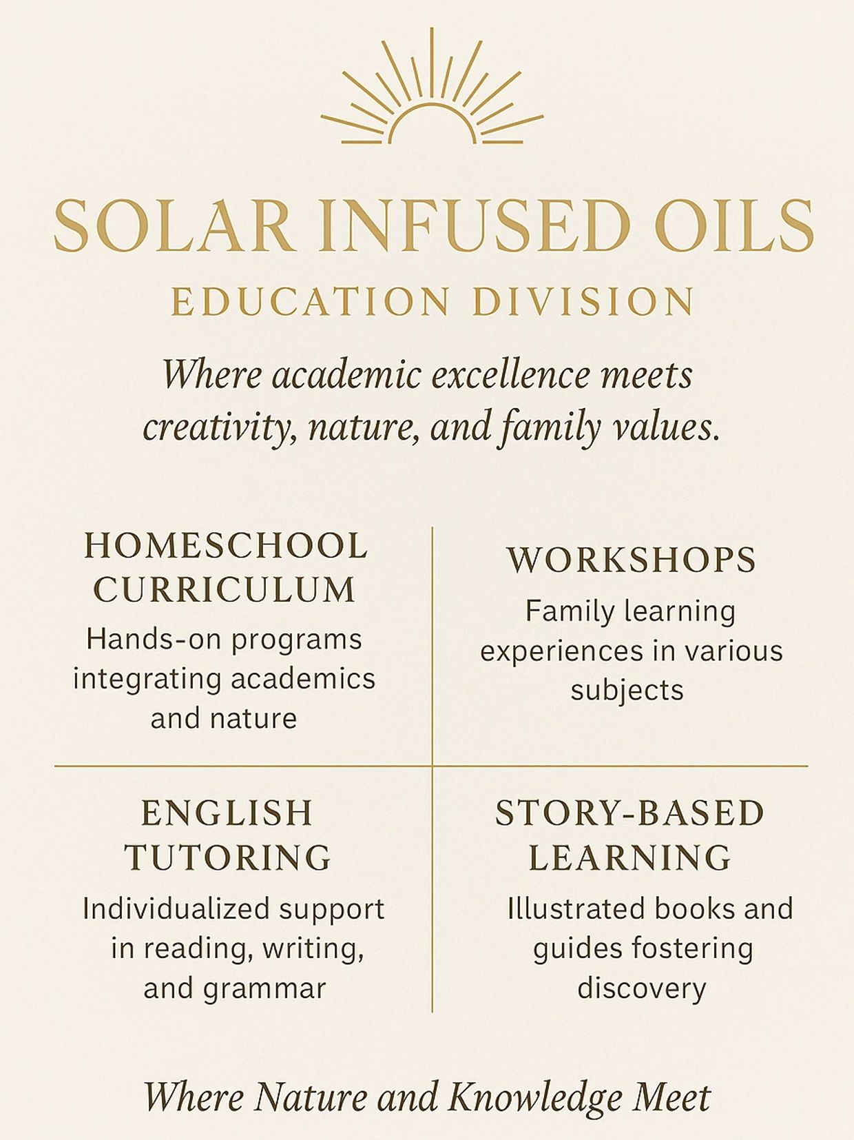 Founded in Alberta, Solar Infused Oils began as a natural wellness brand creating herbal oils and salves through solar infusion — using the energy of the sun to draw out nature’s healing essence. Today, it has grown into a multi-division education and wellness company, empowering families through healing, creativity, and holistic learning. Through Solar Infused Oils Education Division, we continue that mission — shining light through knowledge, compassion, and hands-on discovery.